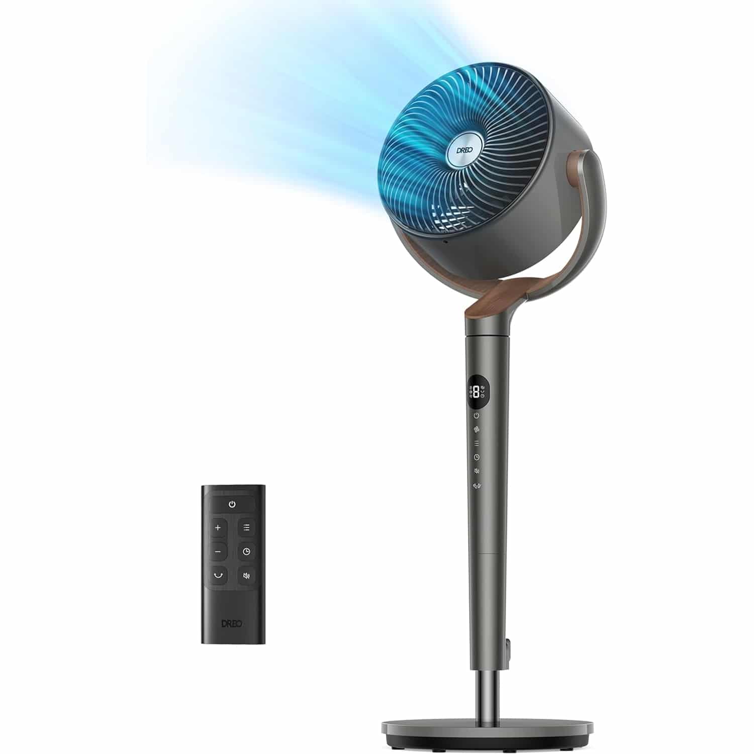 The Dreo PolyFan rounds out our top five with its unique multi-functional design that combines pedestal fan, oscillating fan, and air circulator capabilities into one versatile unit. This model excels in air circulation, projecting airflow up to an impressive 85 feet whilst maintaining remarkably quiet operation thanks to the bionic blade design and air booster technology.