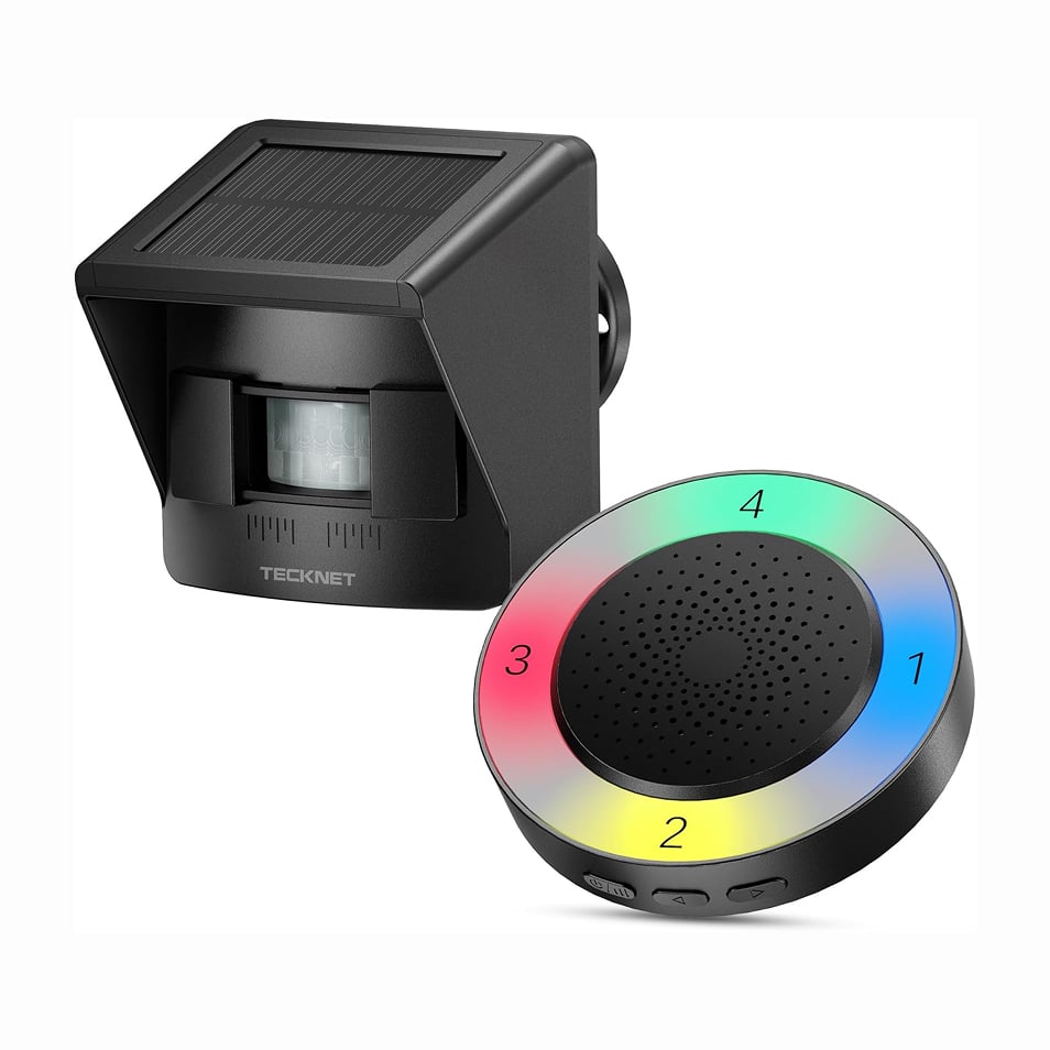 The TECKNET Solar Wireless Driveway Alarm earns fourth place with its unique RGB lighting system and 2,600-foot long-range detection, combining visual and audio alerts for enhanced security awareness. The rotating bracket allows precise adjustment of the sensor's focus and detection angle, with two sensitivity levels covering 16 to 33 feet for flexible monitoring. đ