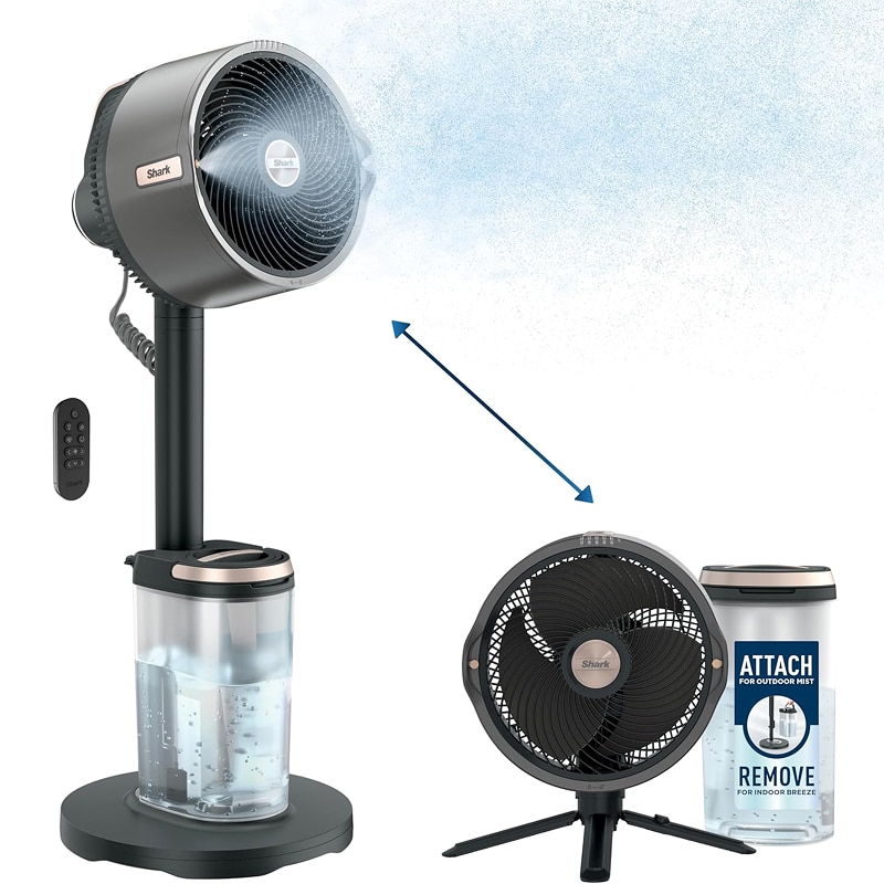 The Shark FlexBreeze Pro Portable Misting Fan earns our second-place ranking with its impressive versatility and powerful performance. This innovative unit bridges the gap between indoor comfort and outdoor cooling with its transformable design that easily switches between pedestal and tabletop configurations.