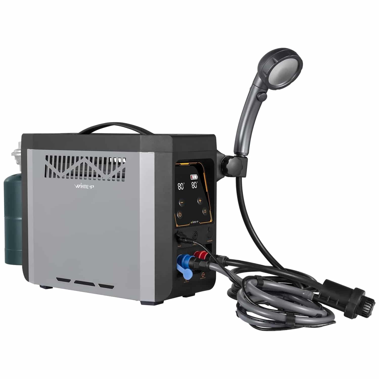 Designed specifically for camping enthusiasts, the WINTEMP operates on standard 1 lb (453g) propane tanks, making fuel replacement convenient at virtually any outdoor retailer. The device adapts seamlessly to various applications including dishwashing, hand washing, showering, and pet cleaning, providing a comprehensive outdoor hygiene solution.