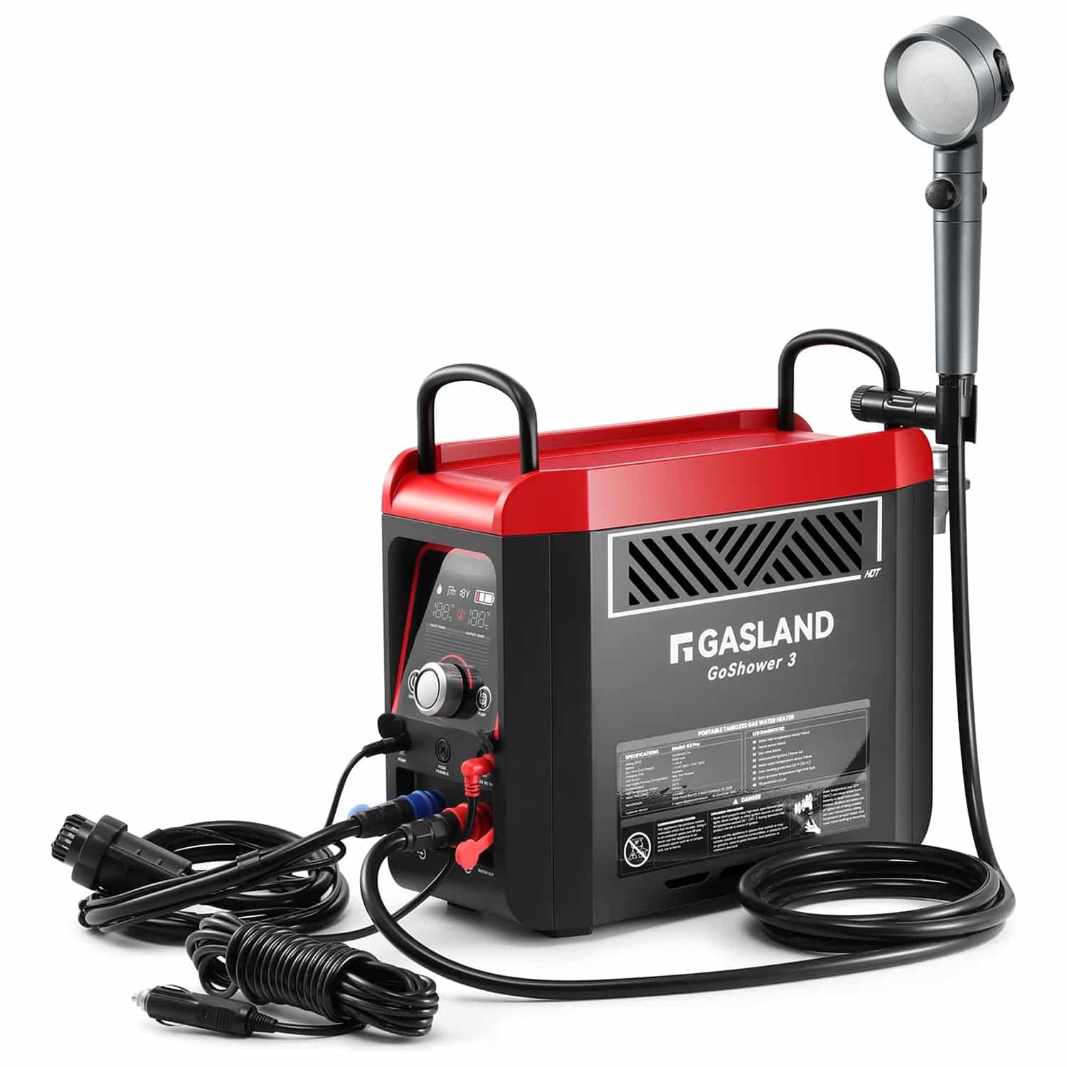 Safety features include automatic shut-off at 122°F to prevent scalding and a built-in tilt switch that deactivates the unit if accidentally knocked over. The adjustable showerhead offers three different spray patterns, providing versatility for showering, dishwashing, and pet cleaning applications.